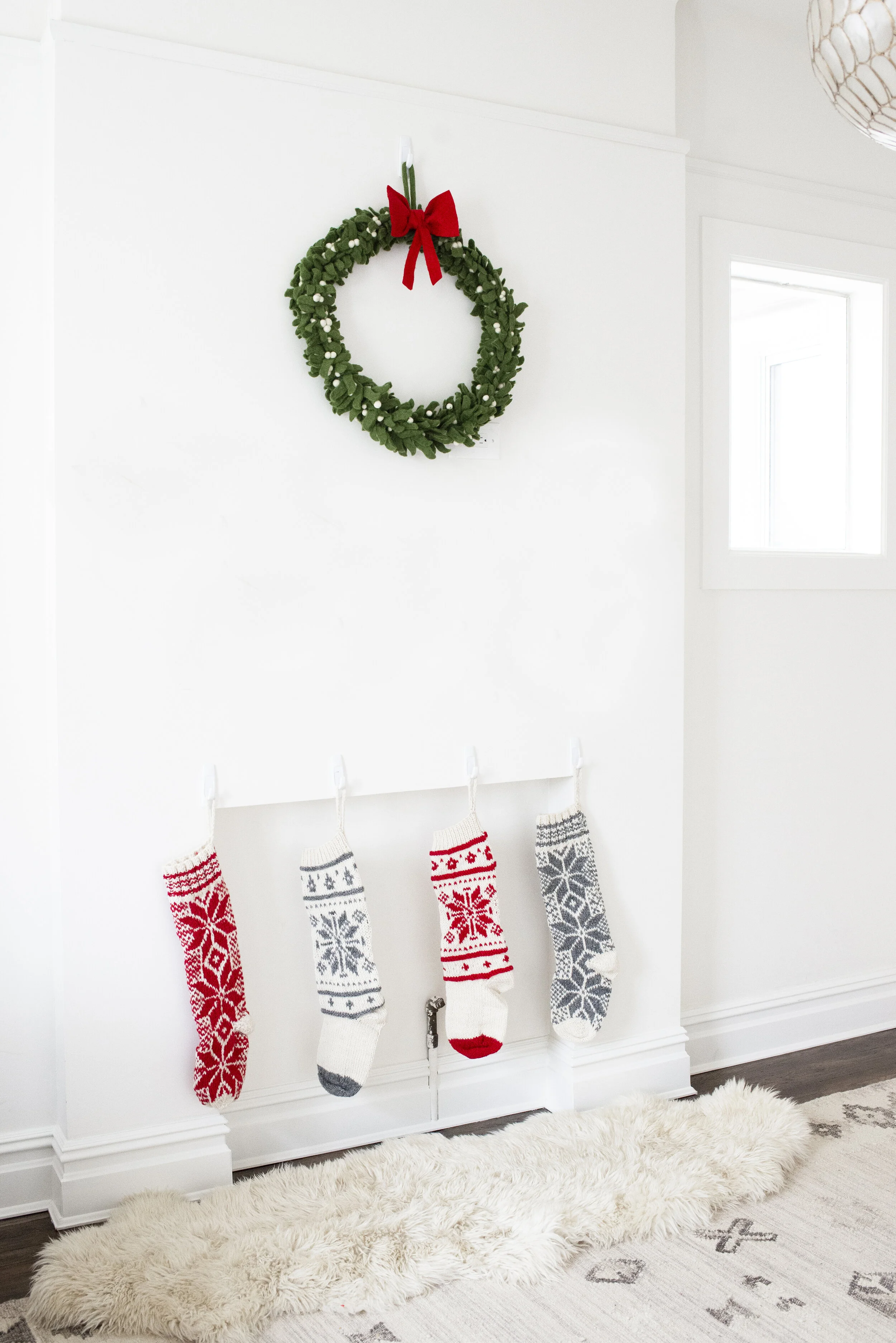 Festive holiday scene with a green wreath and four knit stockings in red and grey hanging on a white wall.