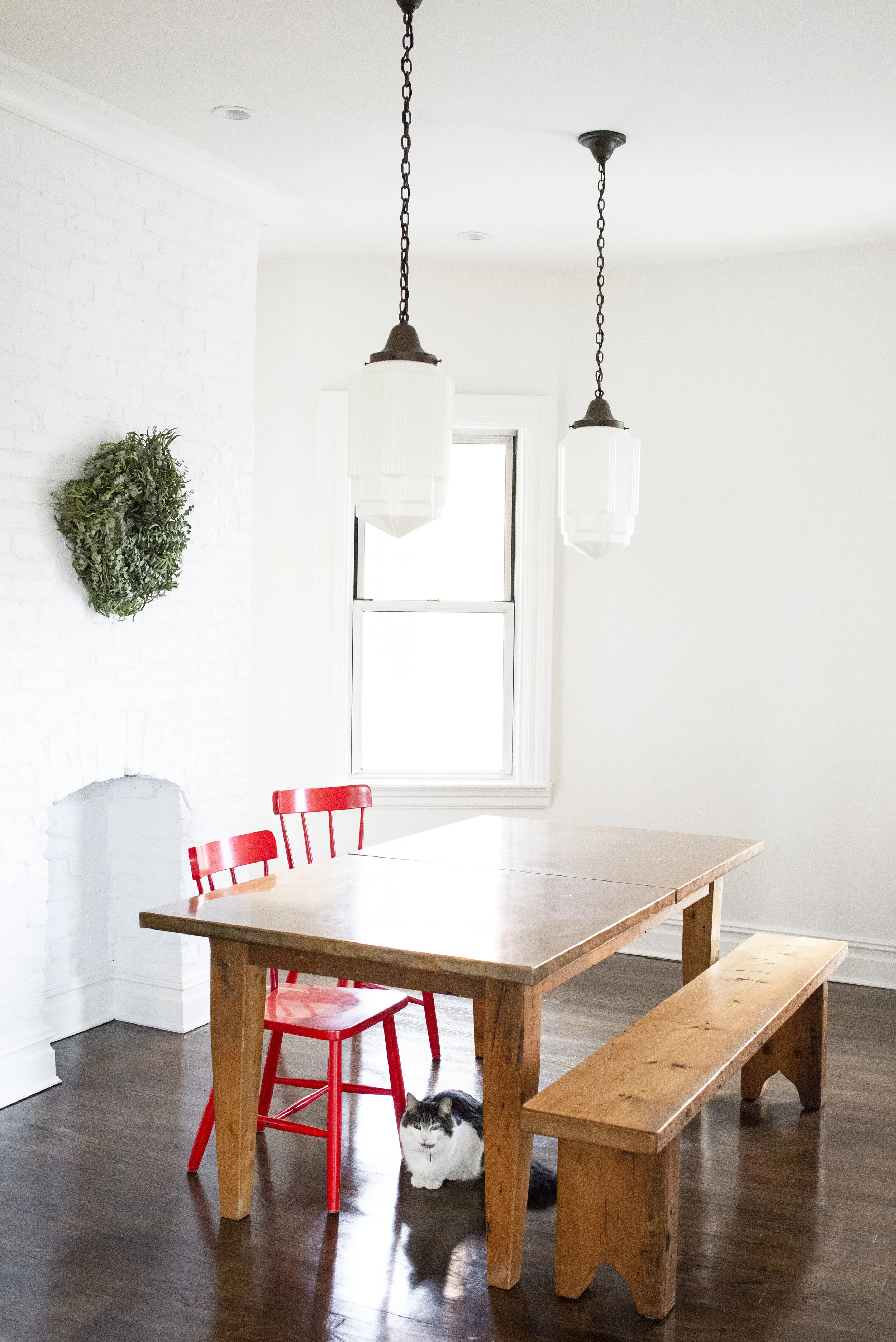 Minimalist dining room with wooden table, red chairs, a bench, pendant lights, white brick wall, wreath, and a cat sitting underneath the table.