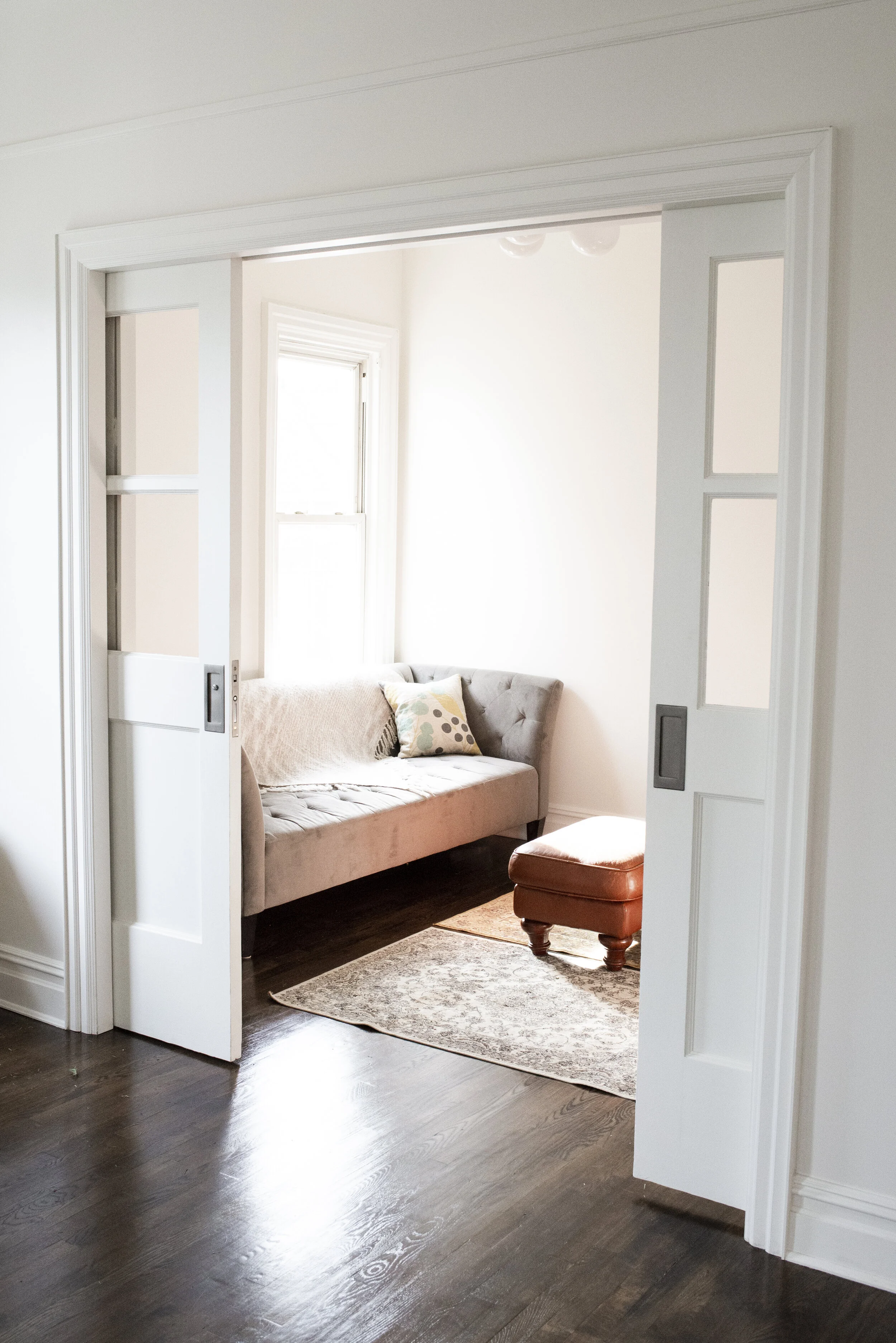 Interior room with sliding doors, gray couch, colorful throw pillows, brown ottoman, and hardwood floor.