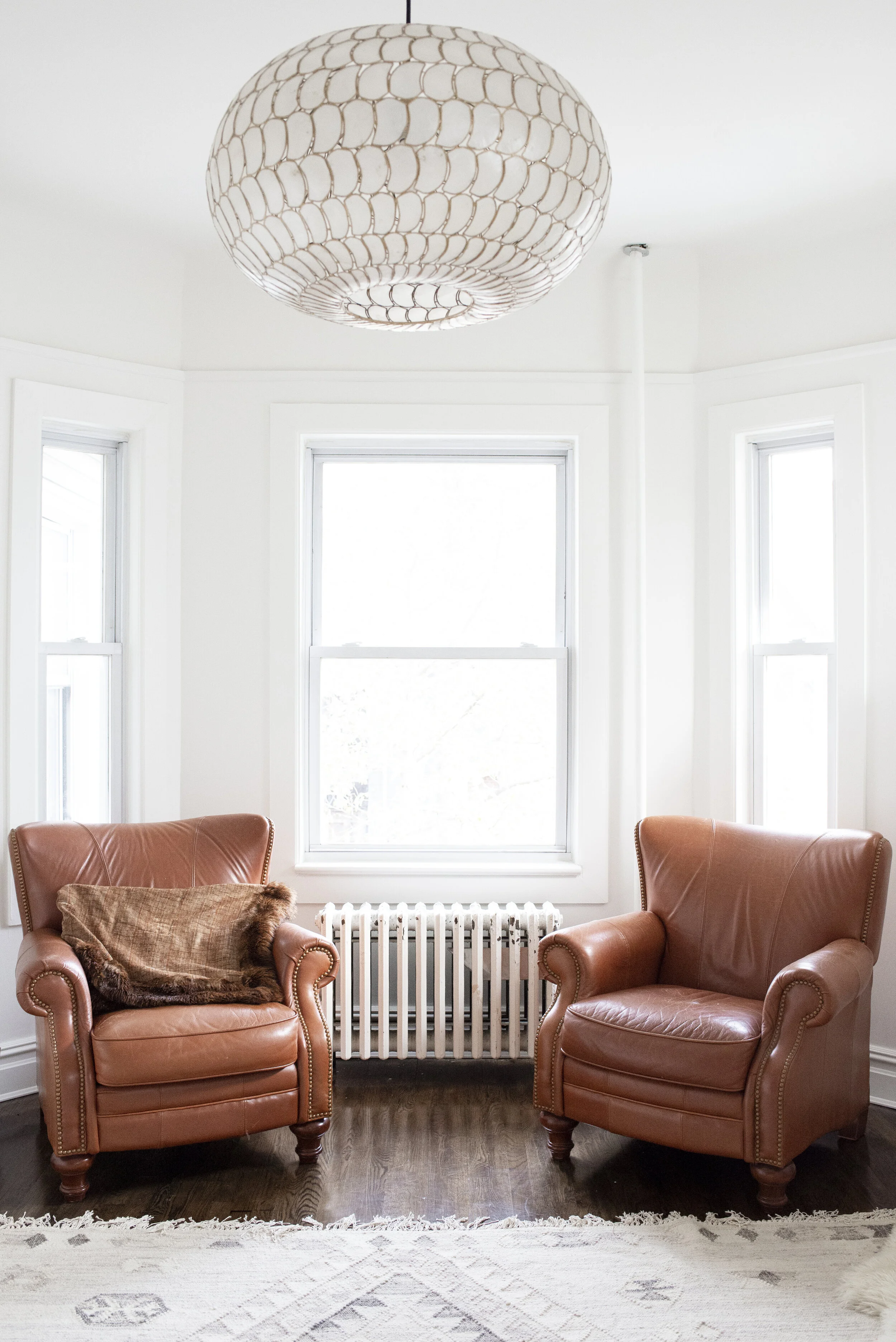 Two brown leather armchairs in a bright room with large windows and a white radiator, under a round ceiling light.