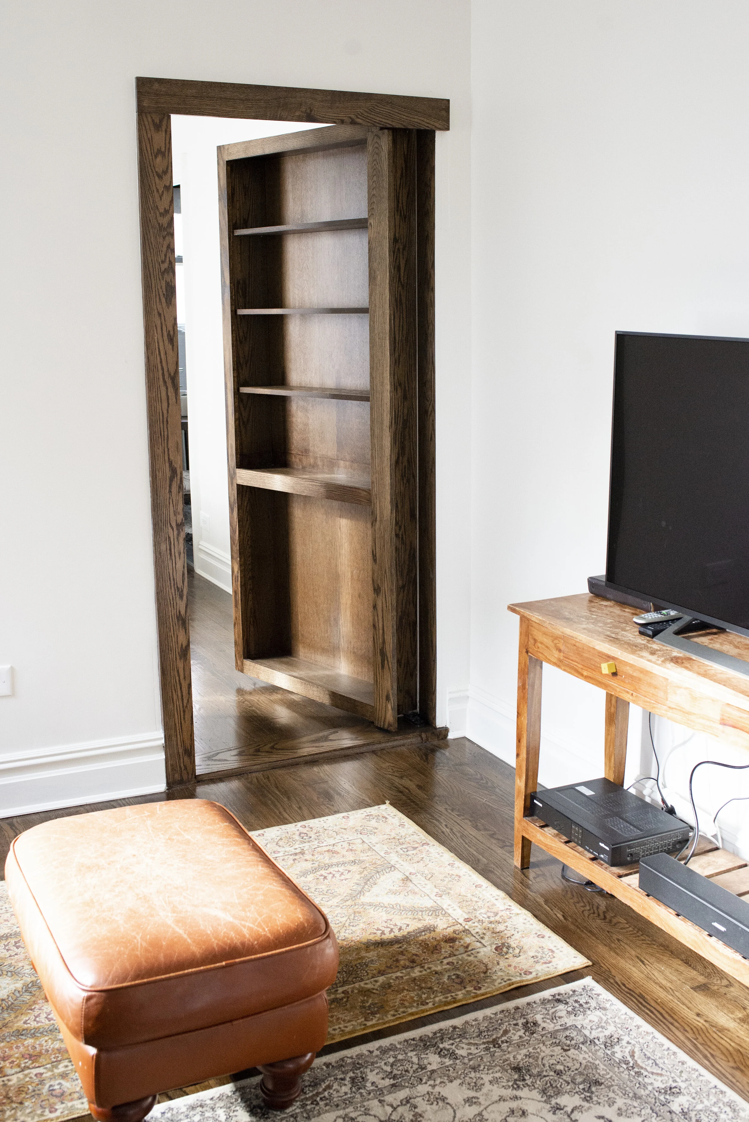 Room with a hidden door designed as a wooden bookshelf, a leather ottoman, flat-screen TV, and wooden console table.