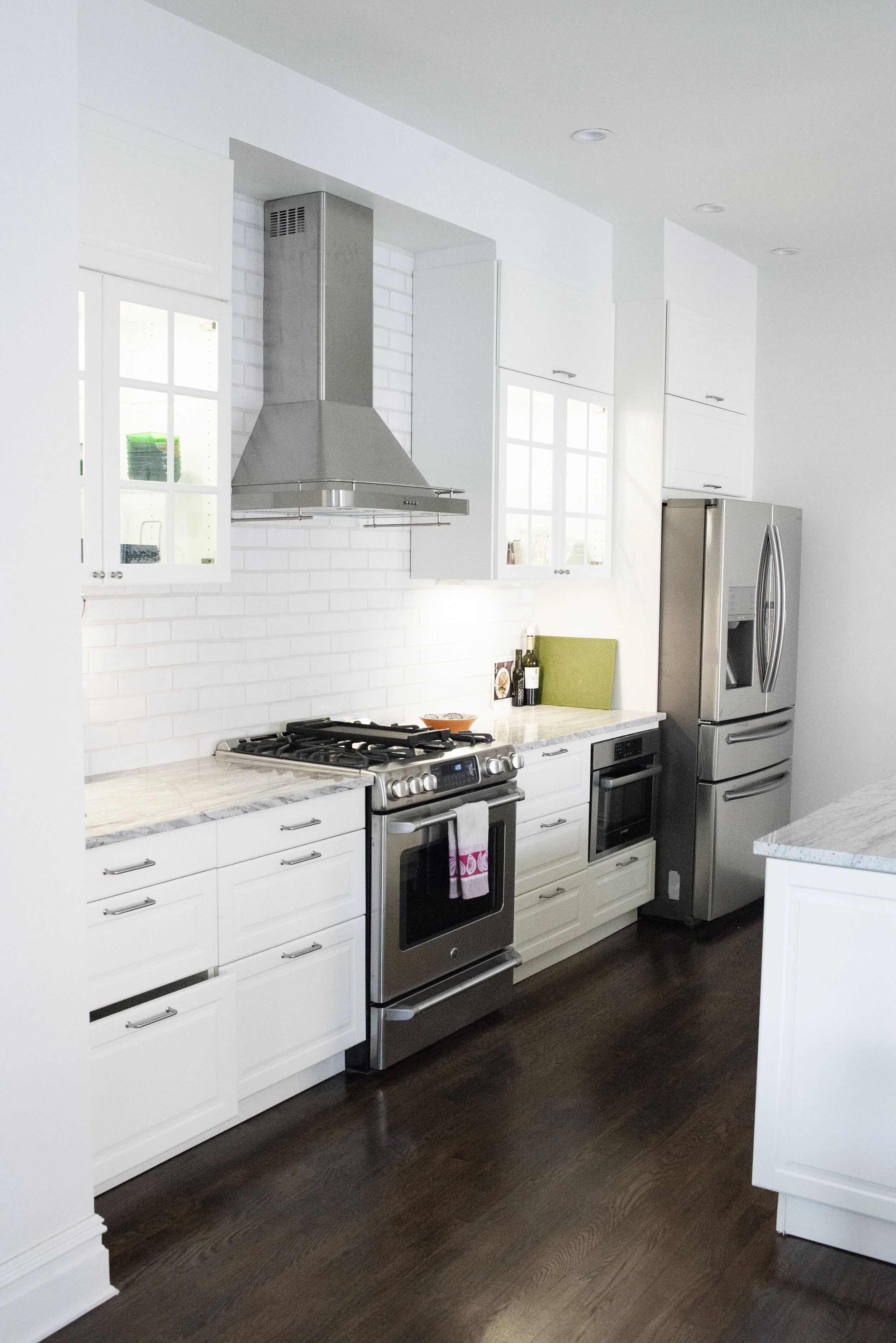 Modern kitchen with stainless steel appliances, white cabinetry, and marble countertops; features a gas stove, range hood, and refrigerator.